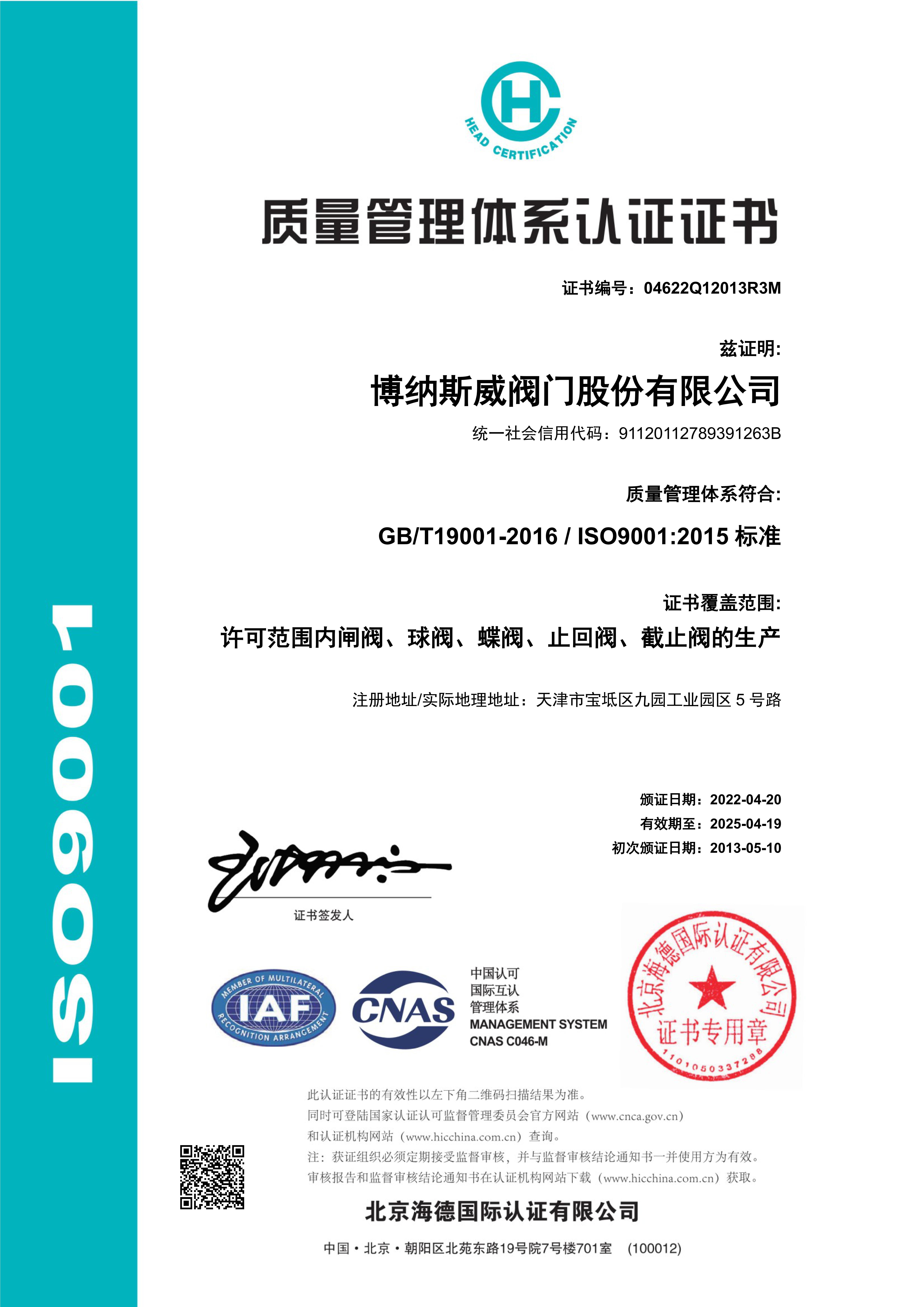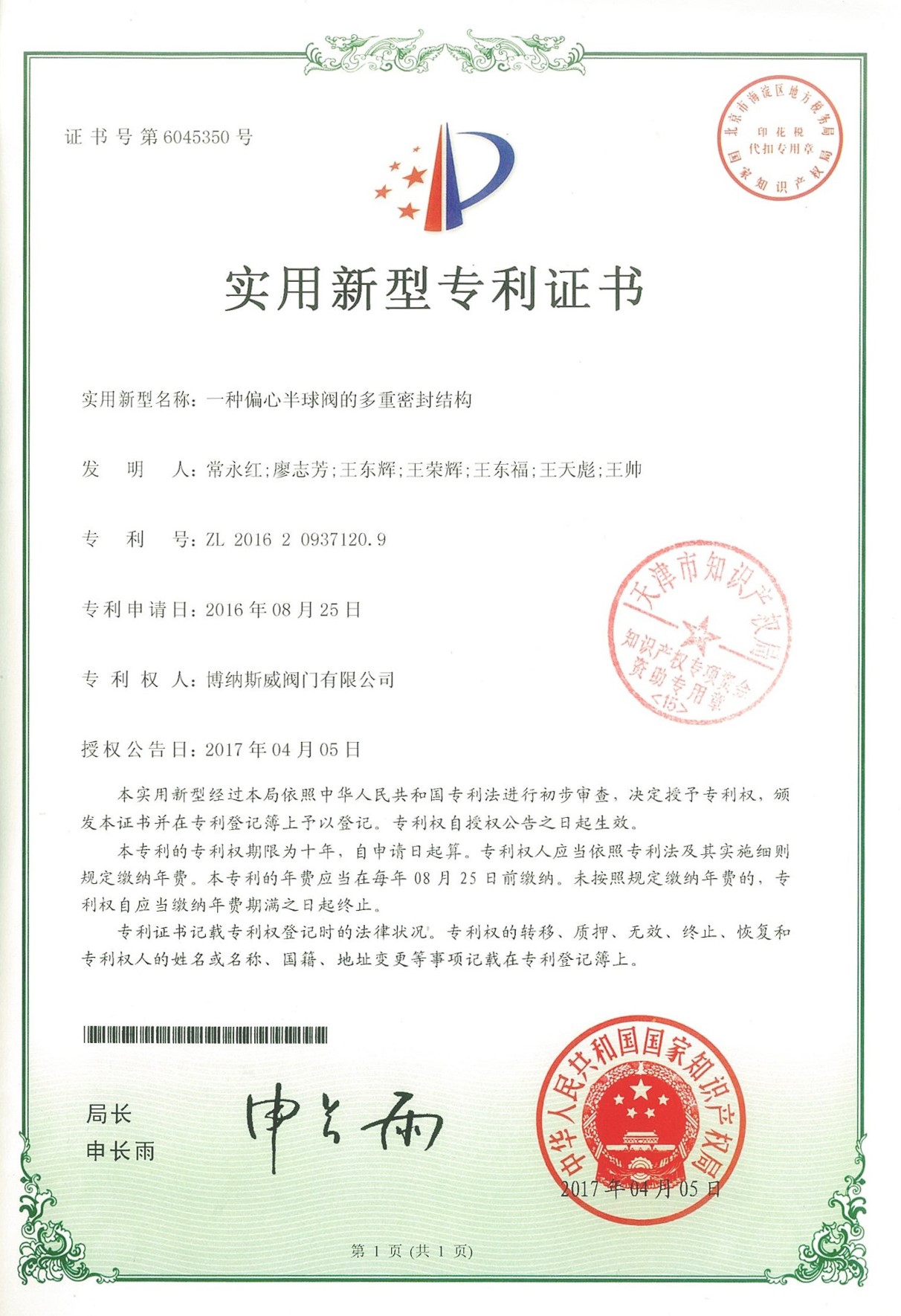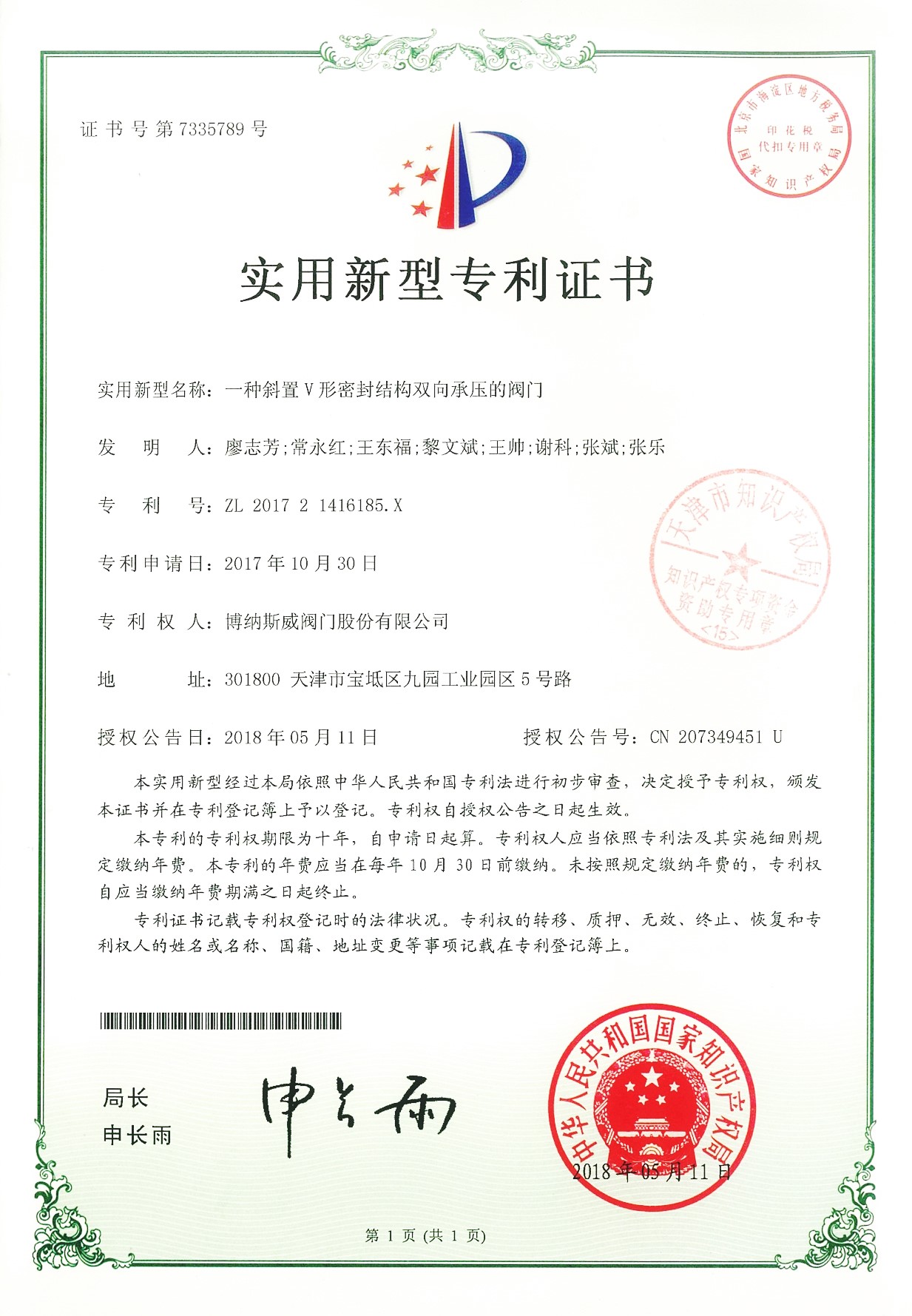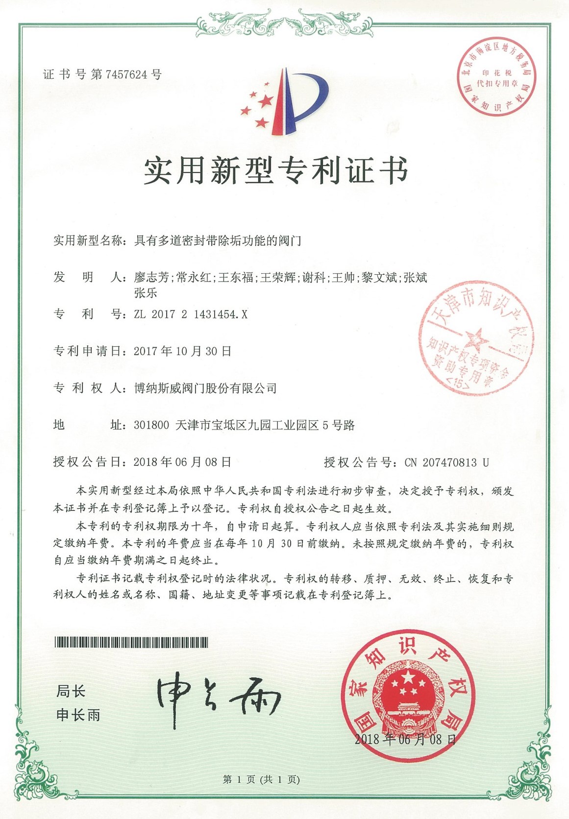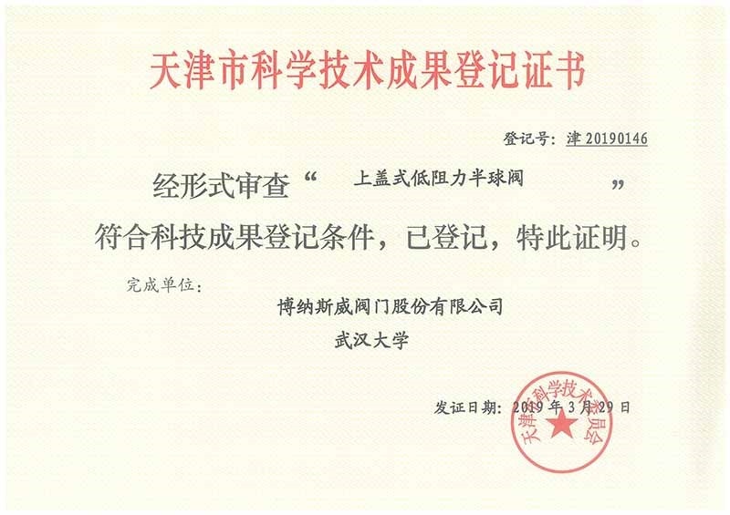 公司先后通過ISO9001質量管理體系、ISO14001環境管理體系、GB/T45001職業健康安全管理體系、歐盟CE等認證,榮獲“高新技術企業”、“國防特種閥門研發中心”、“天津市企業技術中心”等榮譽。公司與武漢大學、長沙理工大學、華北水利水電大學廣泛開展產學研合作。潛心投入也結出累累碩果:獲得200余項專利技術,主編、參編國家和行業標準10多項,在業內重要期刊發表10余篇論文,榮獲中國機械工業科學技術獎1項。