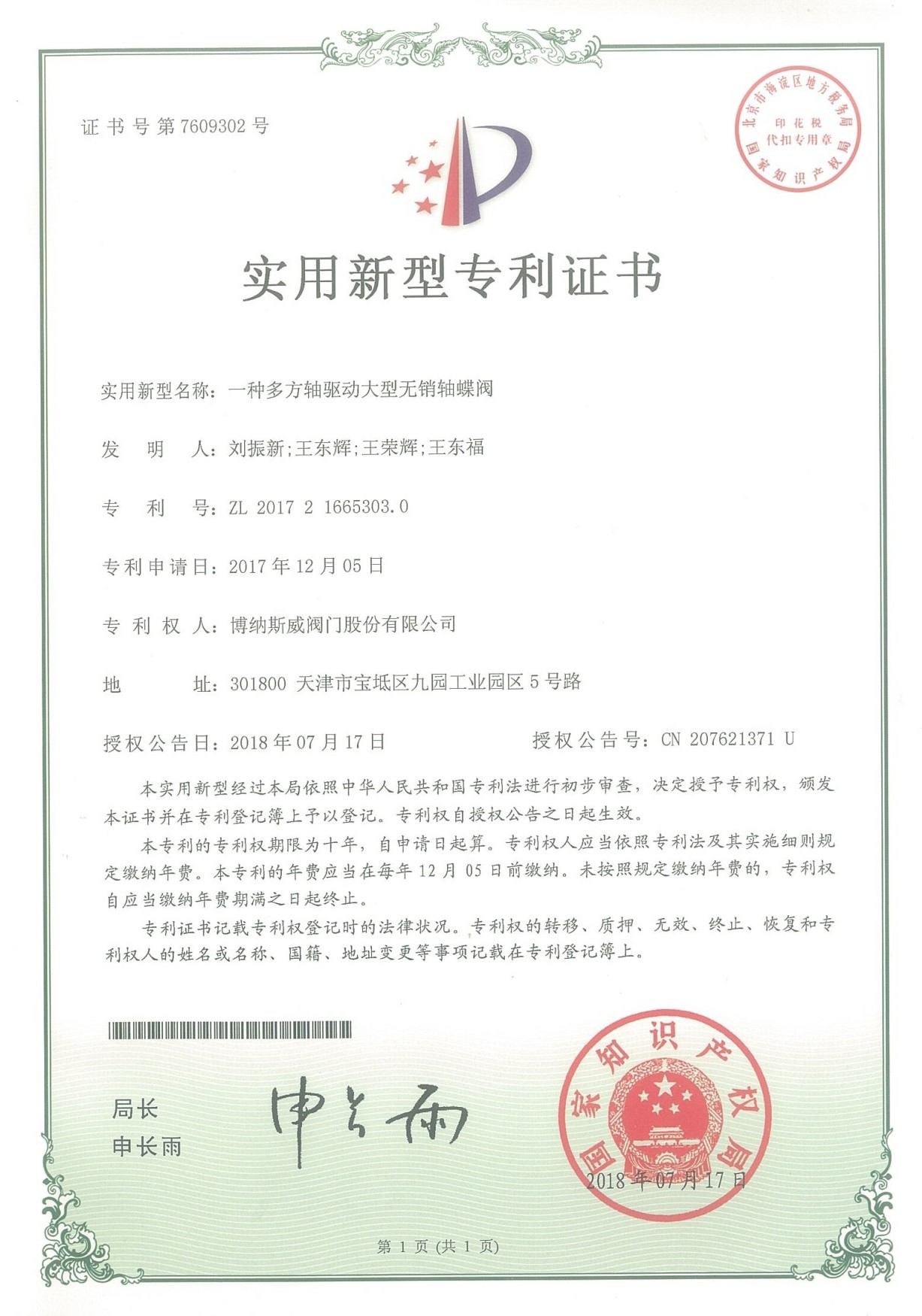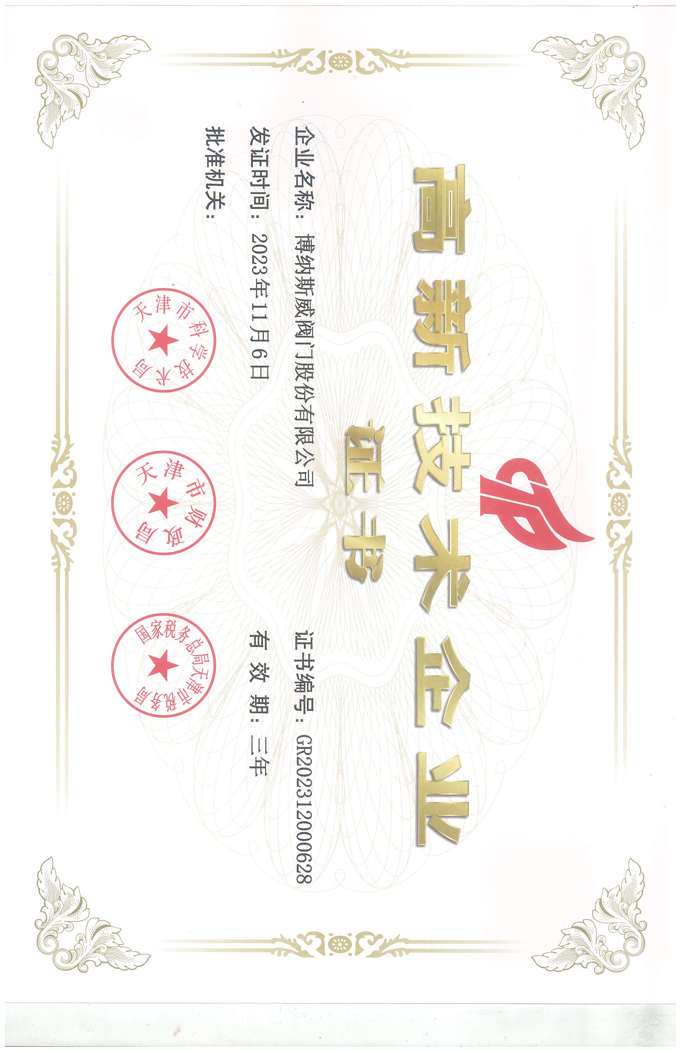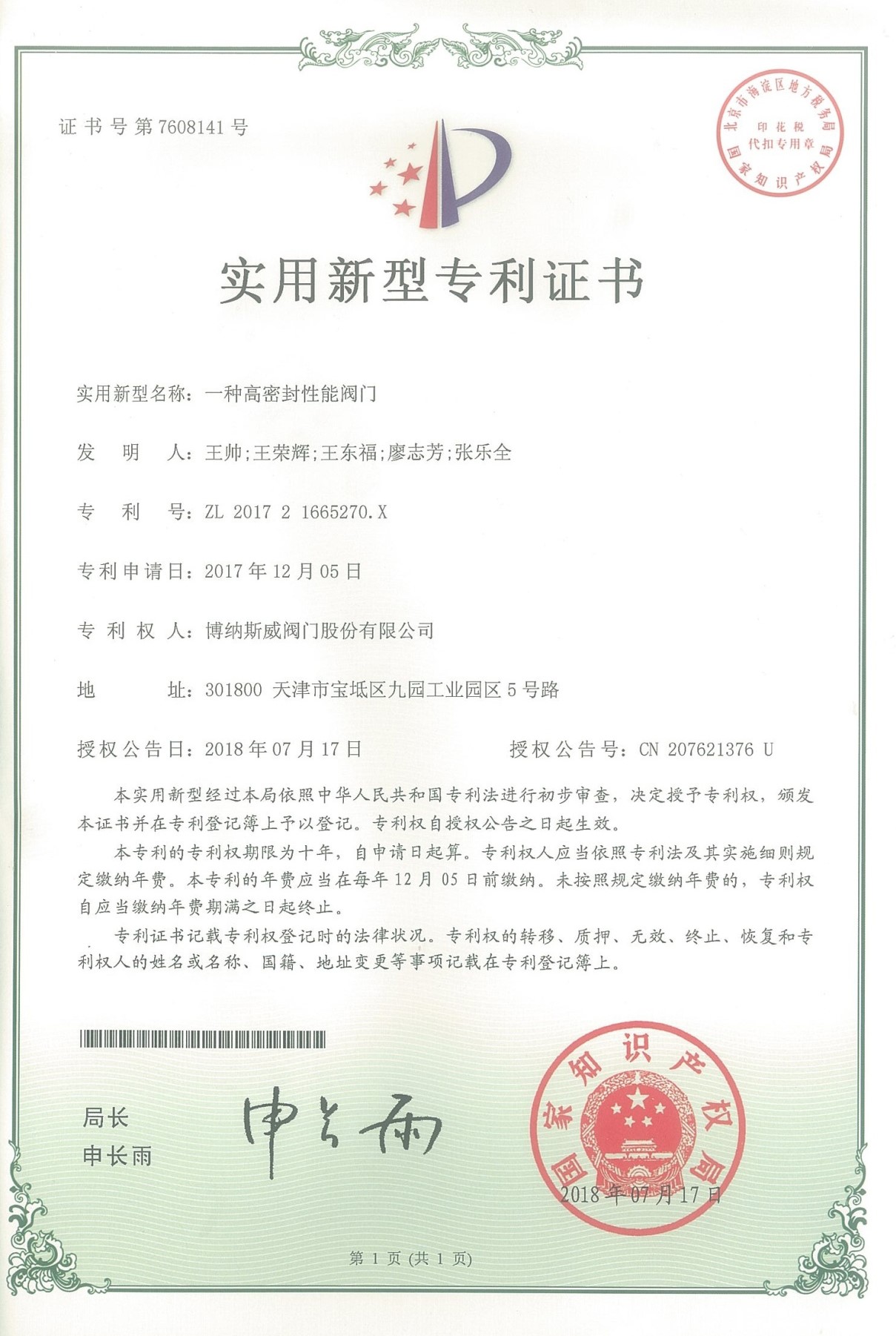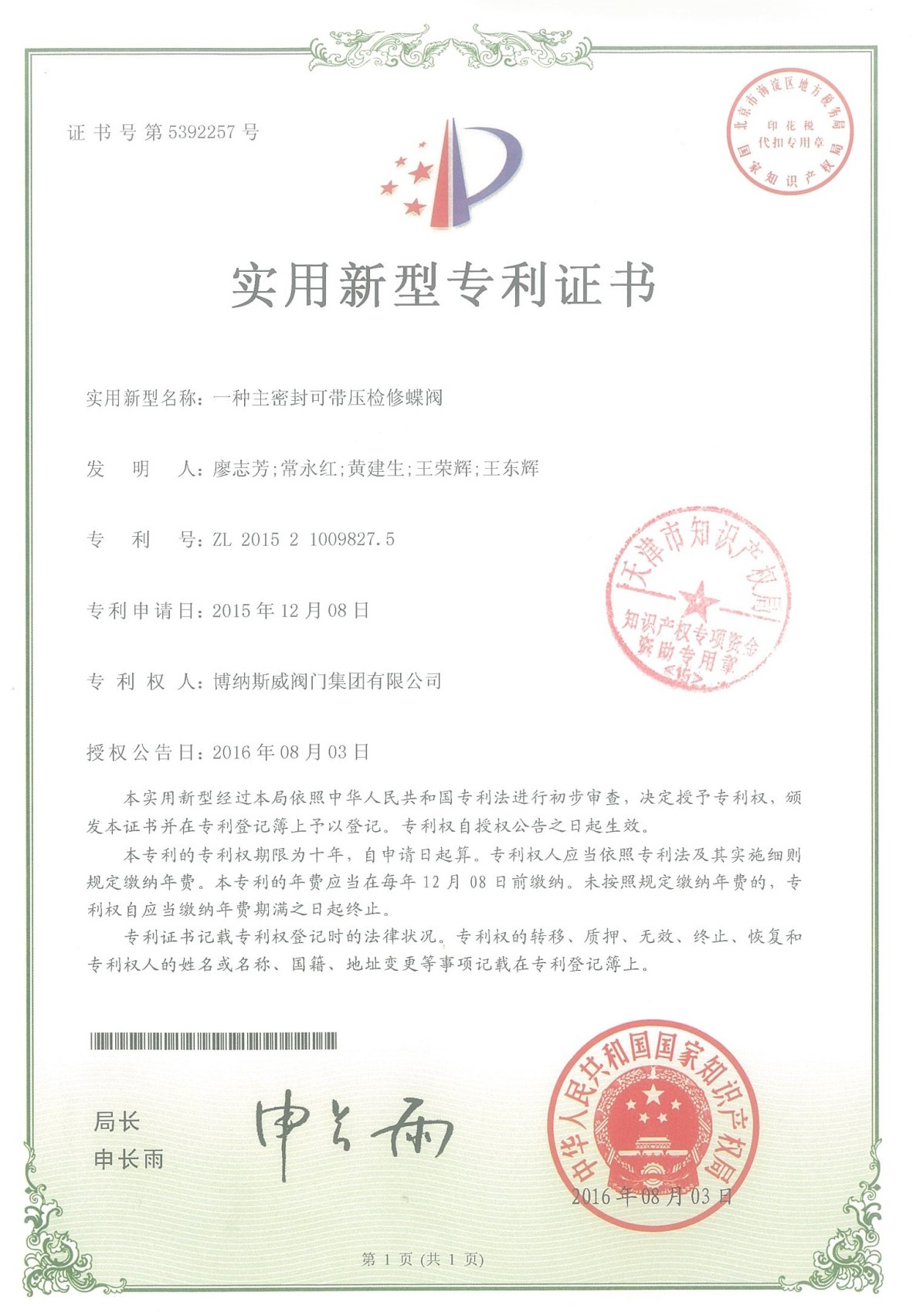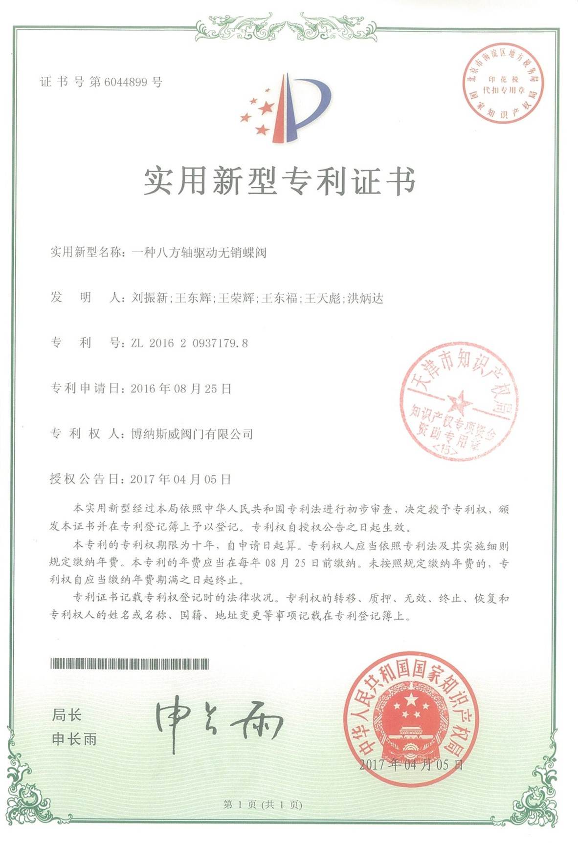 公司先后通過ISO9001質量管理體系、ISO14001環境管理體系、GB/T45001職業健康安全管理體系、歐盟CE等認證,榮獲“高新技術企業”、“國防特種閥門研發中心”、“天津市企業技術中心”等榮譽。公司與武漢大學、長沙理工大學、華北水利水電大學廣泛開展產學研合作。潛心投入也結出累累碩果:獲得200余項專利技術,主編、參編國家和行業標準10多項,在業內重要期刊發表10余篇論文,榮獲中國機械工業科學技術獎1項。