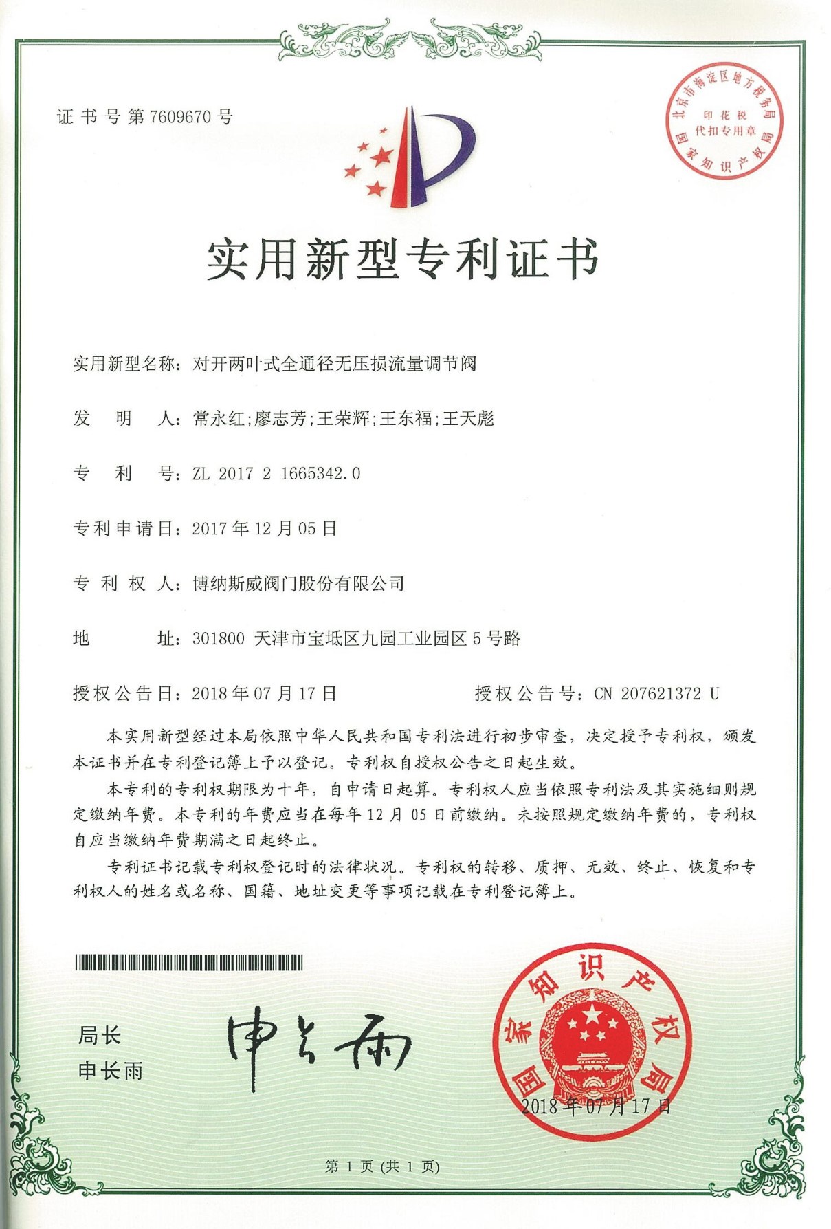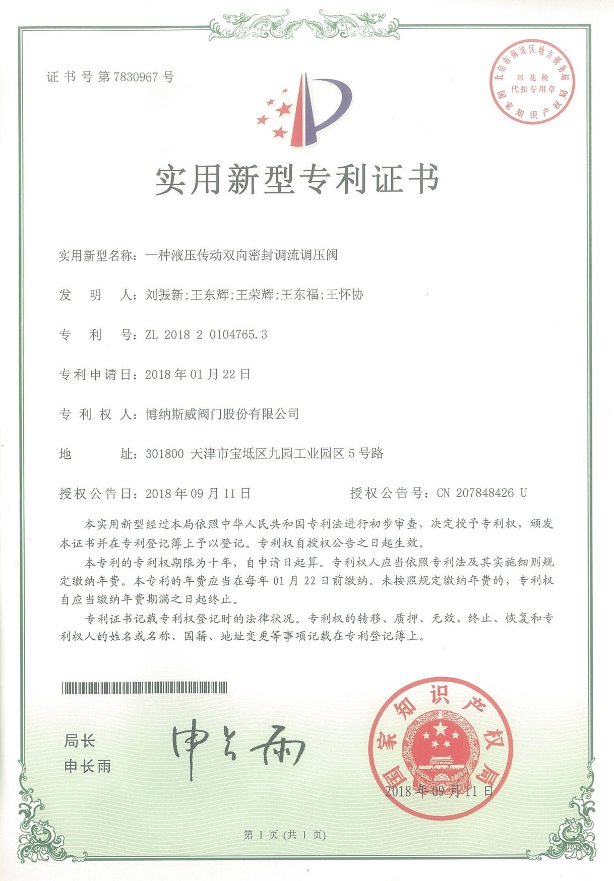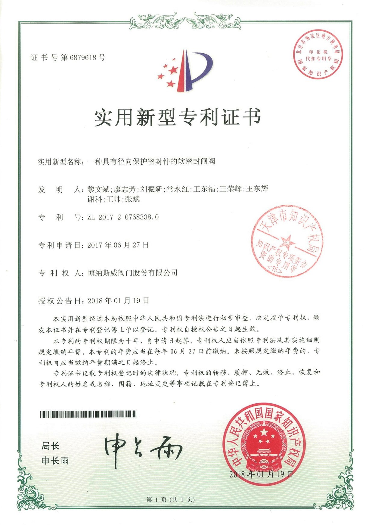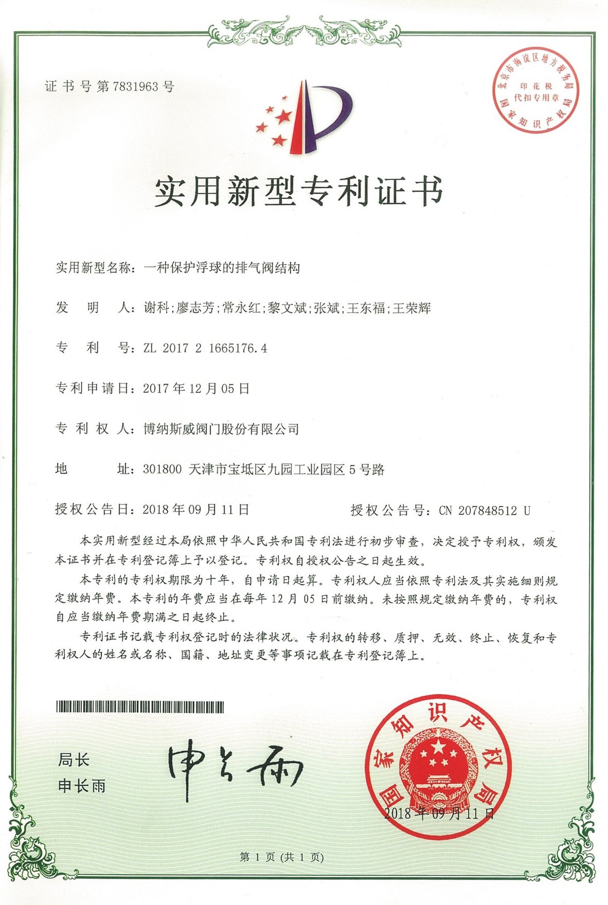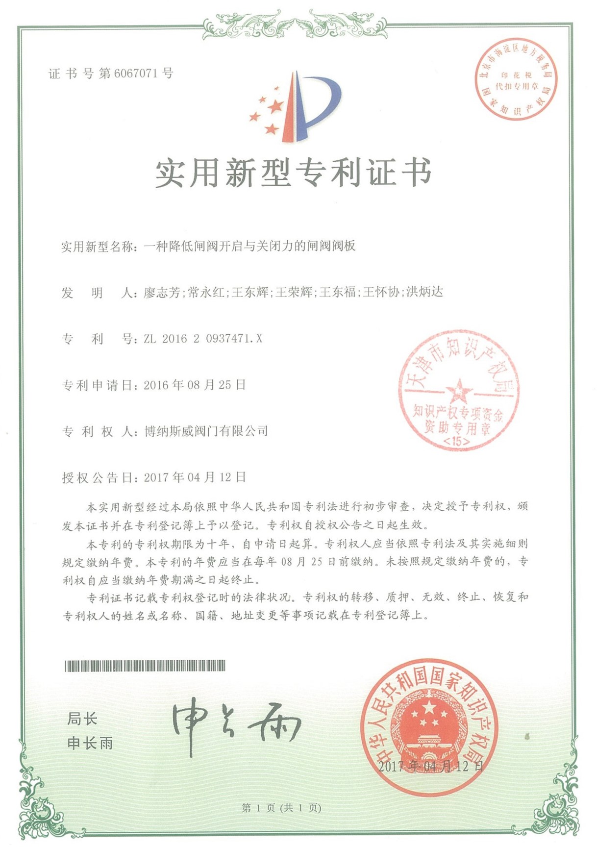 公司先后通過ISO9001質量管理體系、ISO14001環境管理體系、GB/T45001職業健康安全管理體系、歐盟CE等認證,榮獲“高新技術企業”、“國防特種閥門研發中心”、“天津市企業技術中心”等榮譽。公司與武漢大學、長沙理工大學、華北水利水電大學廣泛開展產學研合作。潛心投入也結出累累碩果:獲得200余項專利技術,主編、參編國家和行業標準10多項,在業內重要期刊發表10余篇論文,榮獲中國機械工業科學技術獎1項。