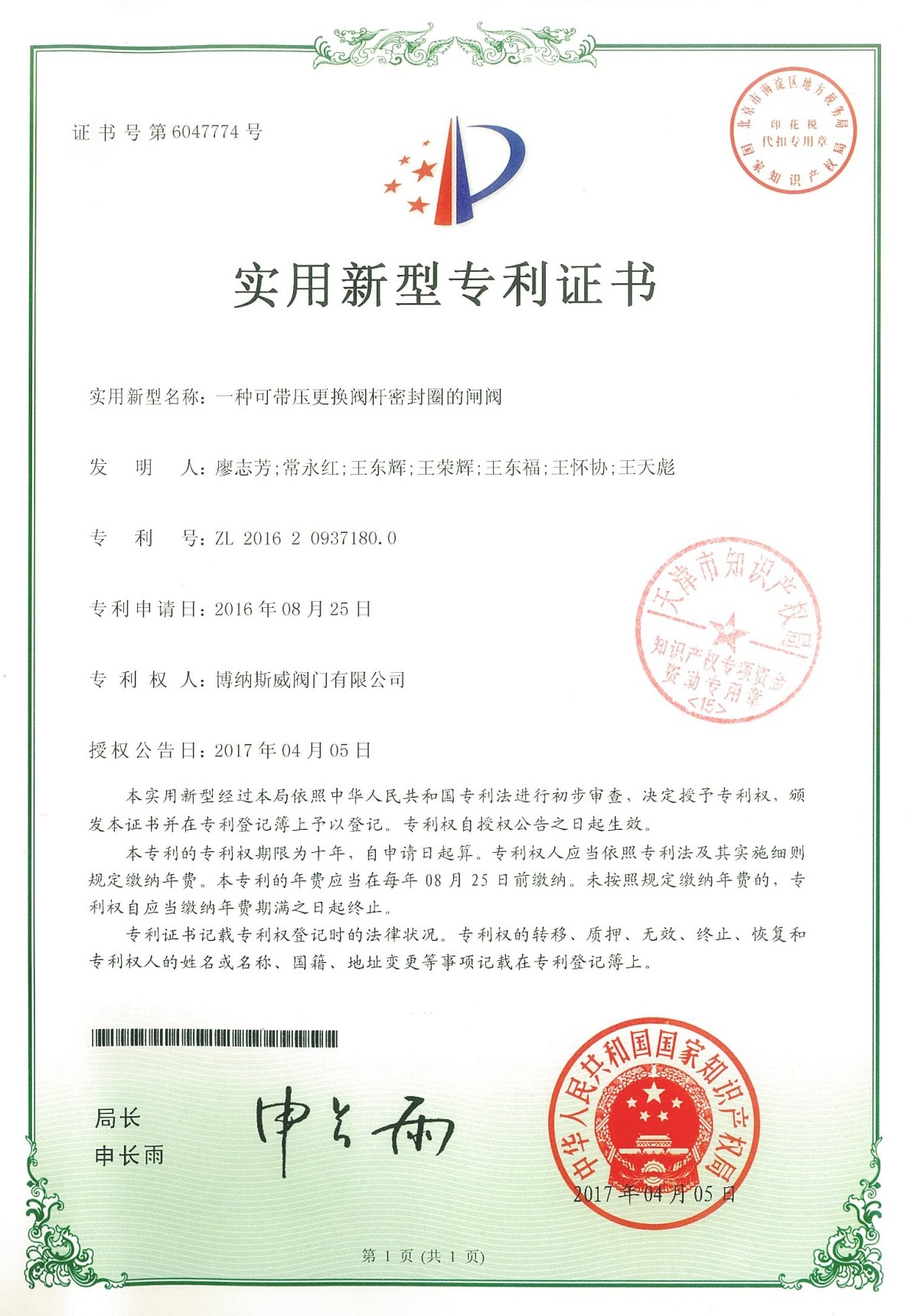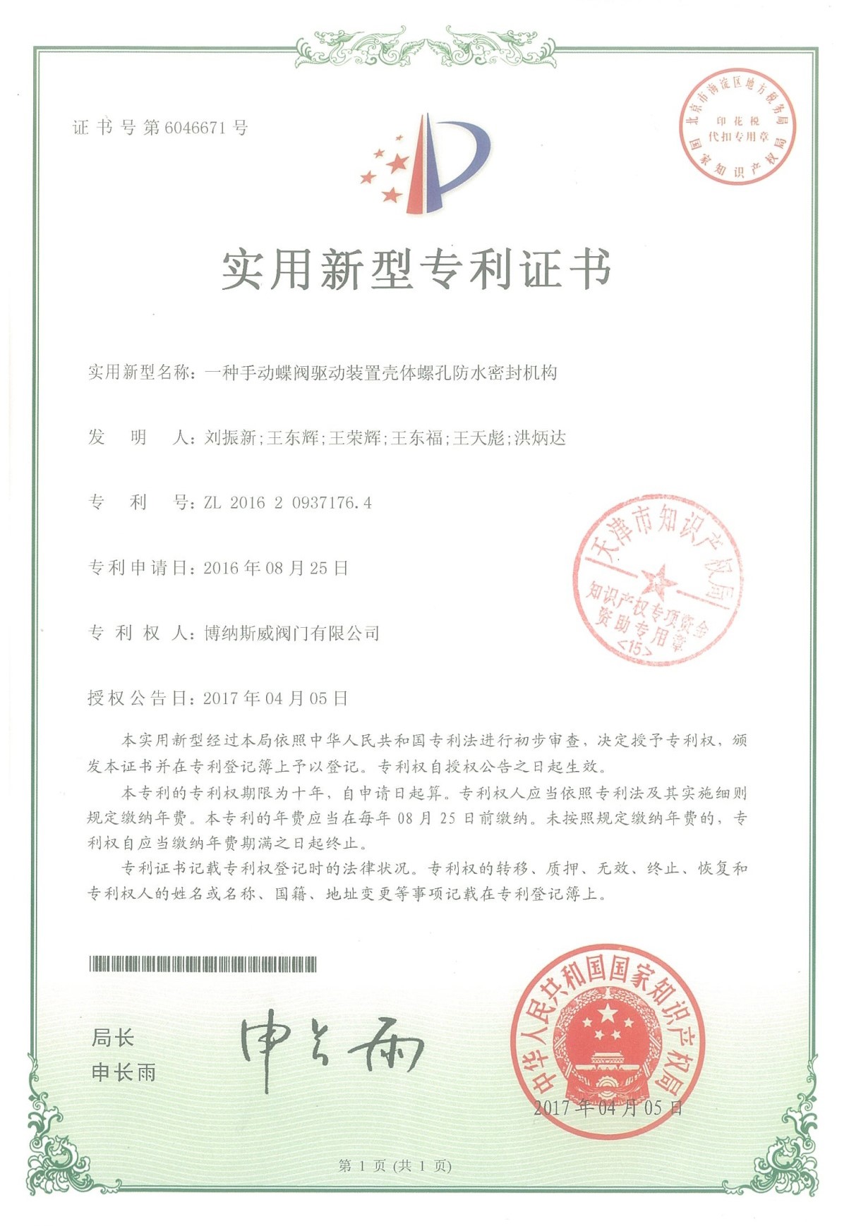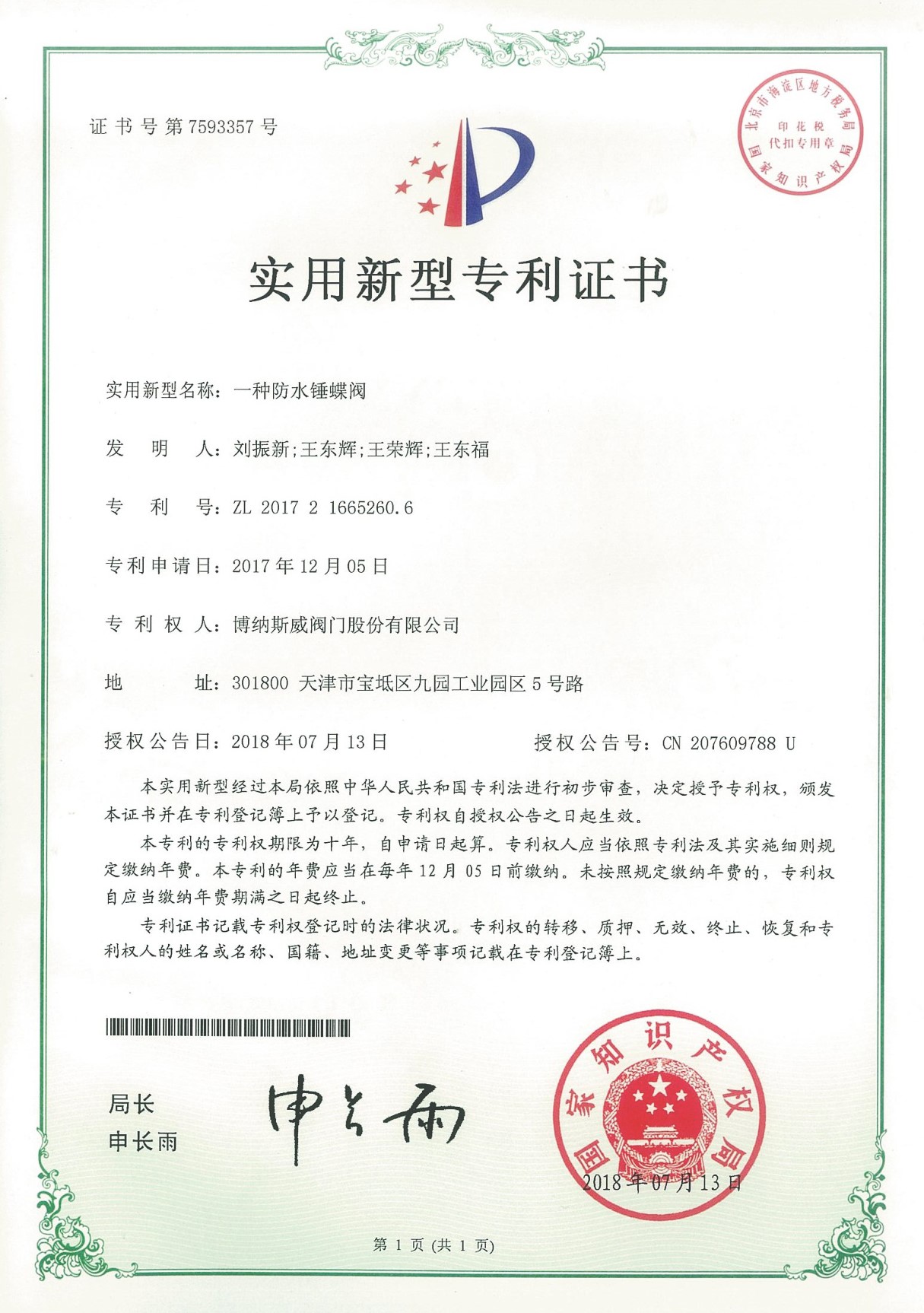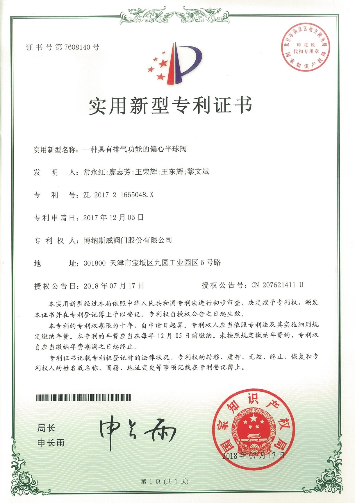 公司先后通過ISO9001質量管理體系、ISO14001環境管理體系、GB/T45001職業健康安全管理體系、歐盟CE等認證,榮獲“高新技術企業”、“國防特種閥門研發中心”、“天津市企業技術中心”等榮譽。公司與武漢大學、長沙理工大學、華北水利水電大學廣泛開展產學研合作。潛心投入也結出累累碩果:獲得200余項專利技術,主編、參編國家和行業標準10多項,在業內重要期刊發表10余篇論文,榮獲中國機械工業科學技術獎1項。