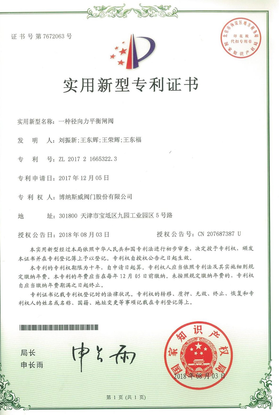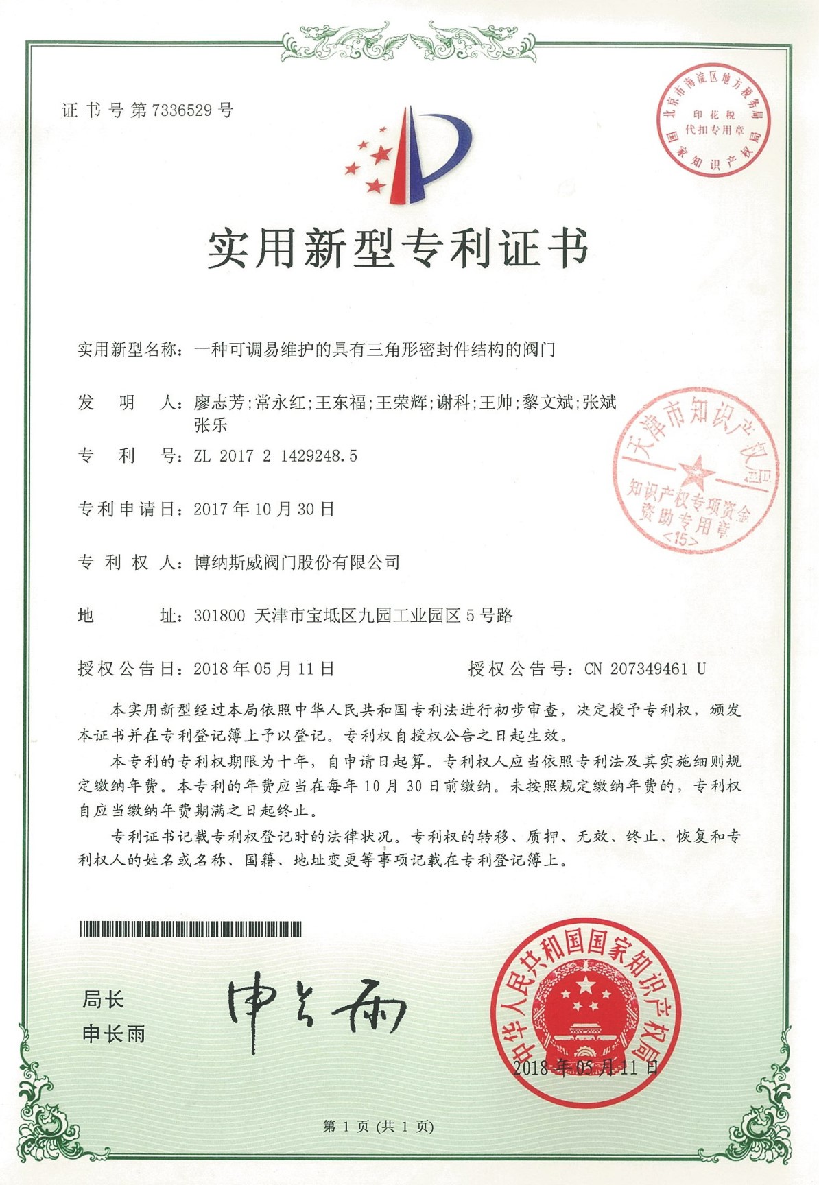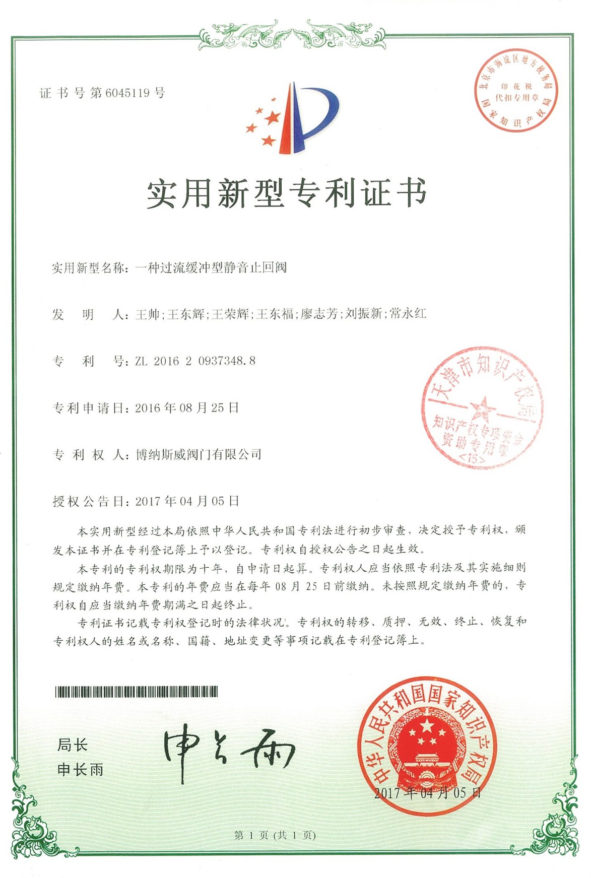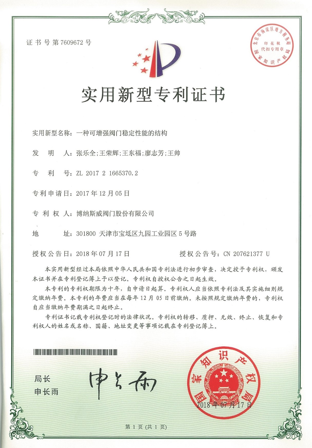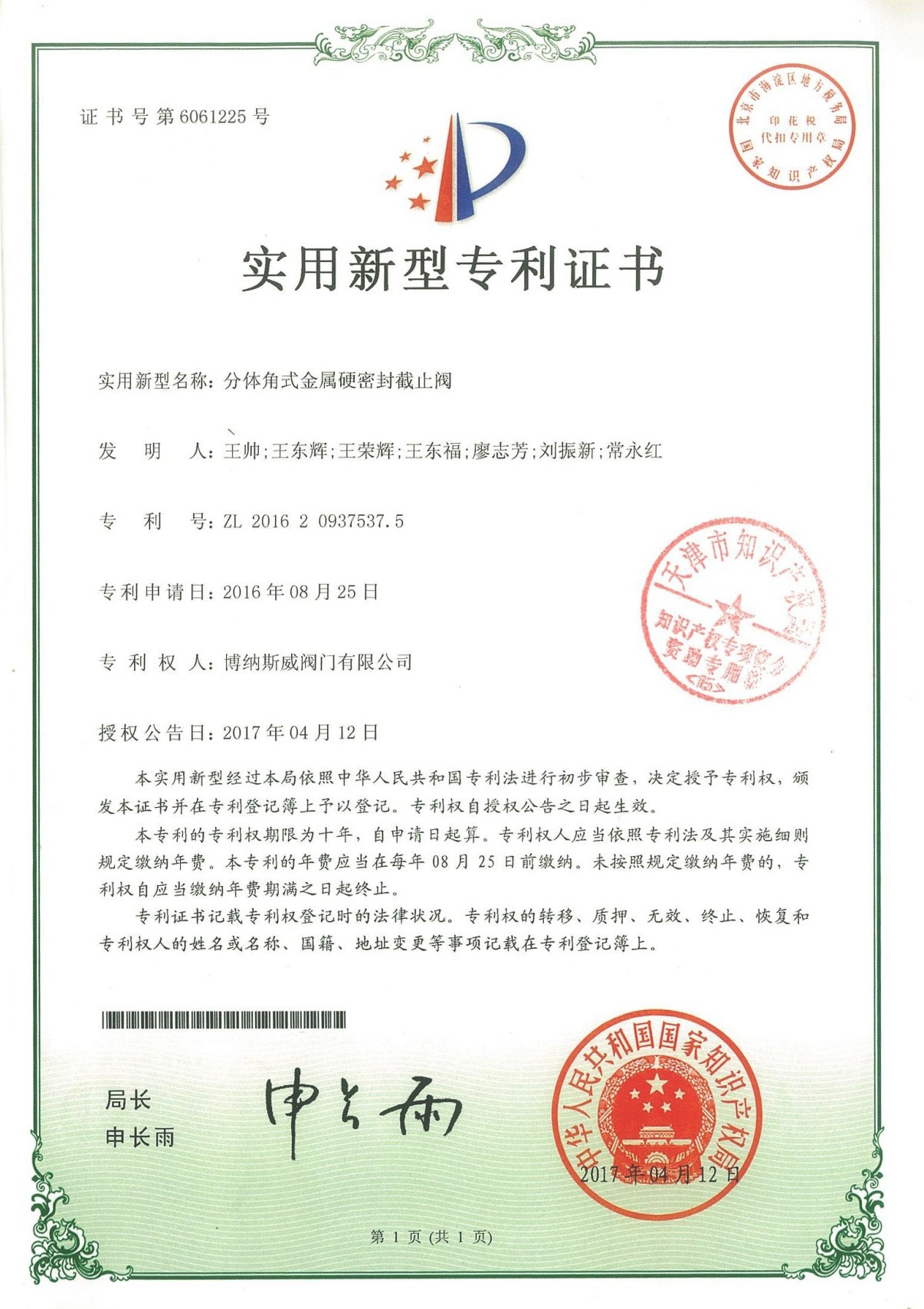 公司先后通過ISO9001質量管理體系、ISO14001環境管理體系、GB/T45001職業健康安全管理體系、歐盟CE等認證,榮獲“高新技術企業”、“國防特種閥門研發中心”、“天津市企業技術中心”等榮譽。公司與武漢大學、長沙理工大學、華北水利水電大學廣泛開展產學研合作。潛心投入也結出累累碩果:獲得200余項專利技術,主編、參編國家和行業標準10多項,在業內重要期刊發表10余篇論文,榮獲中國機械工業科學技術獎1項。