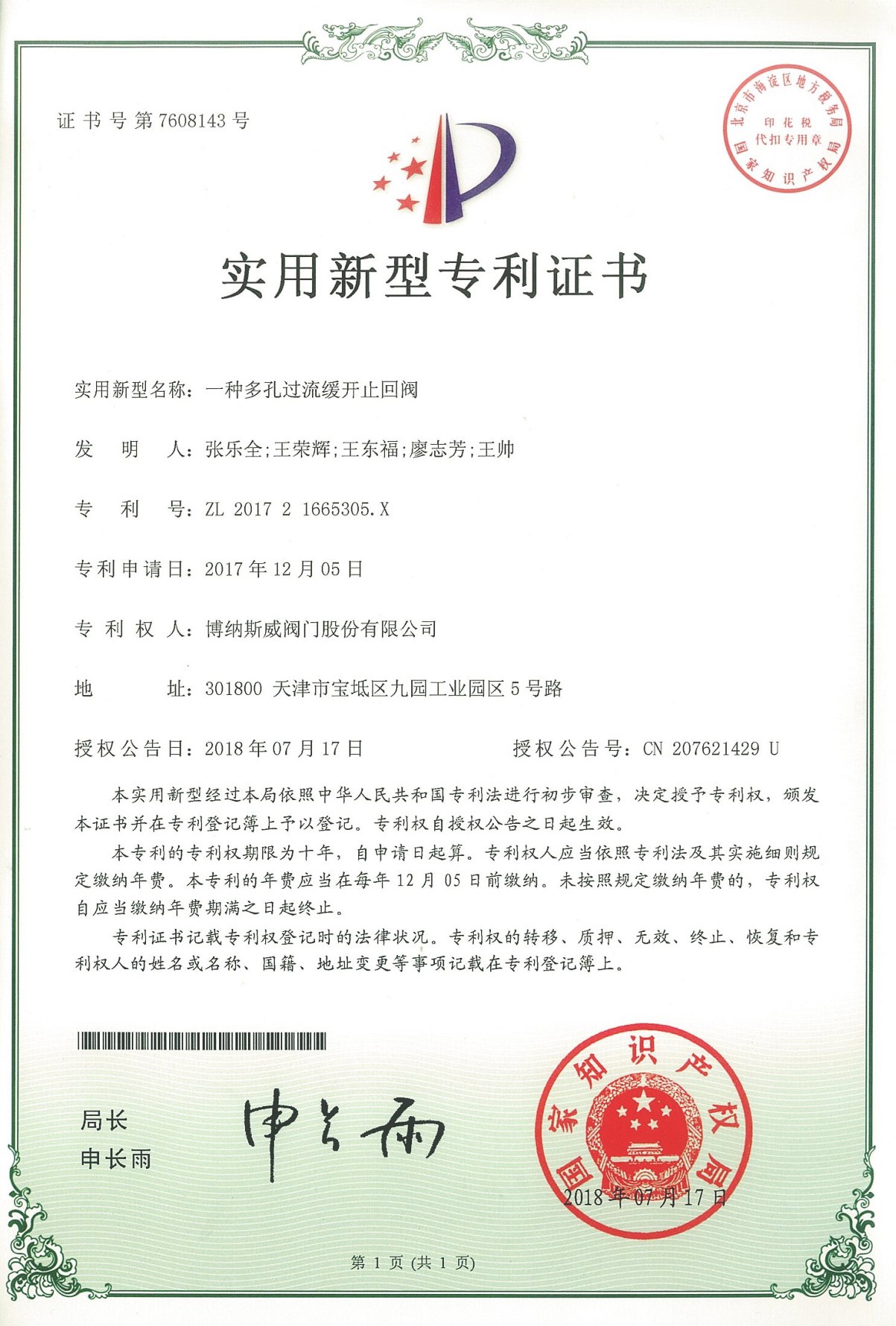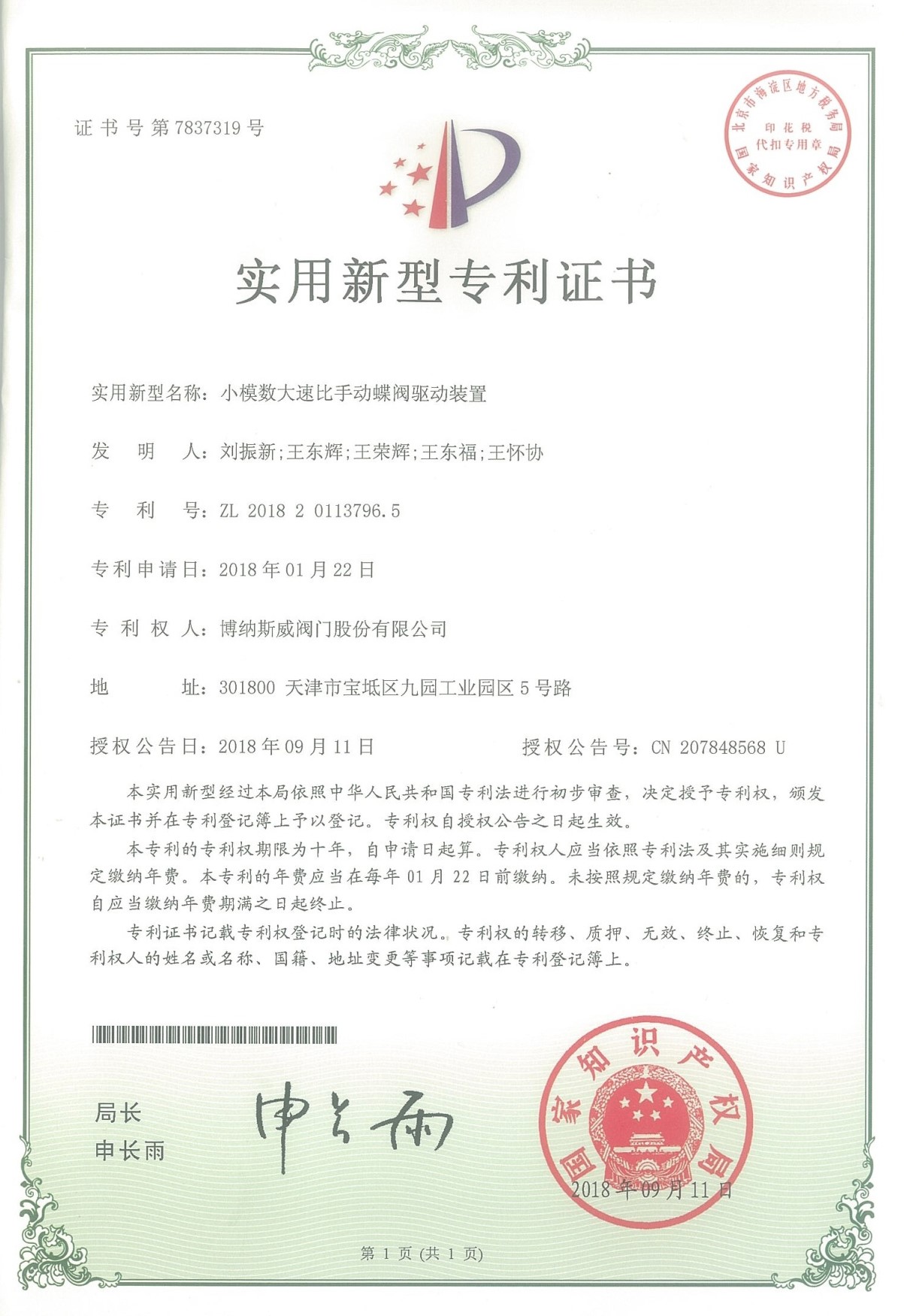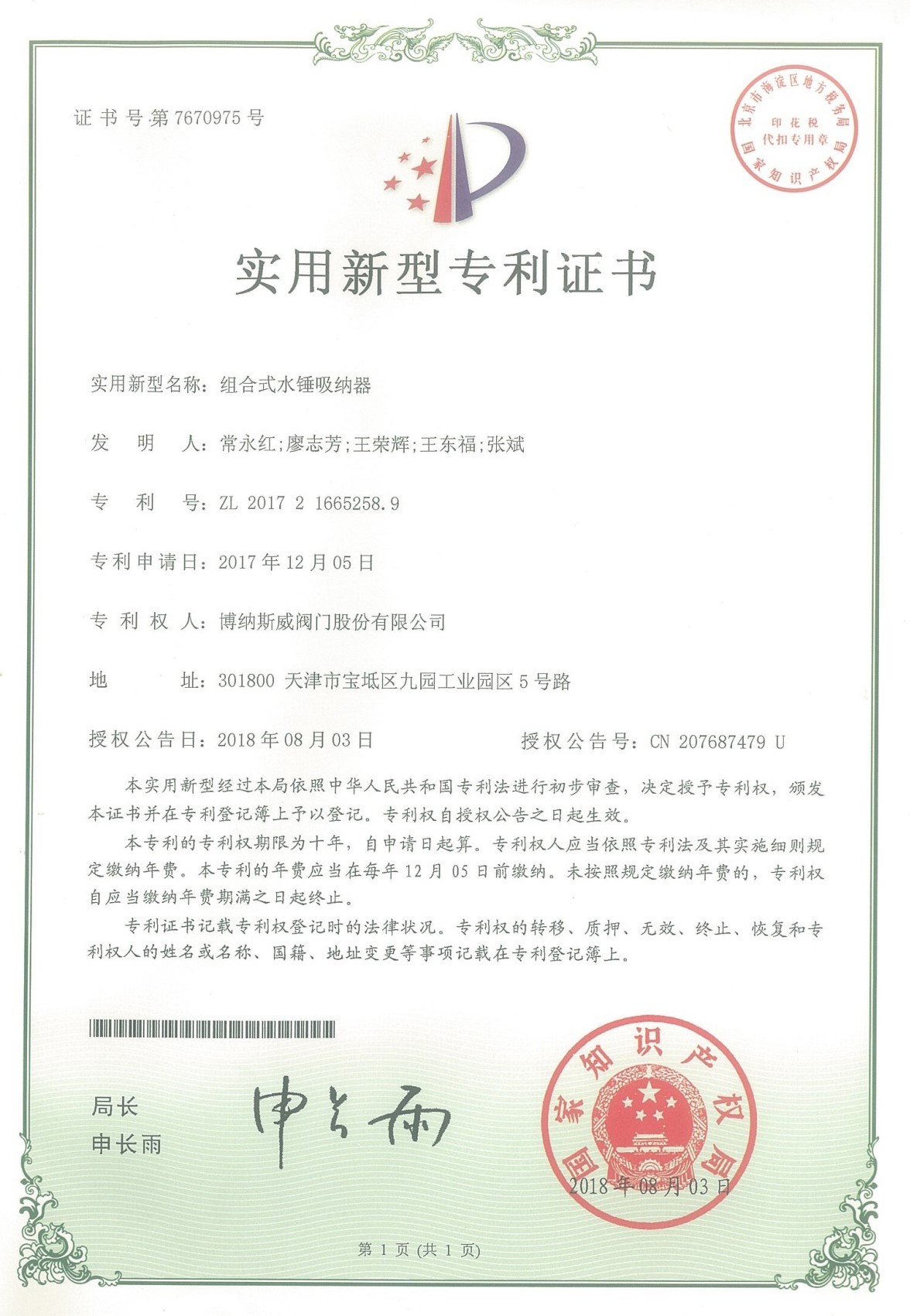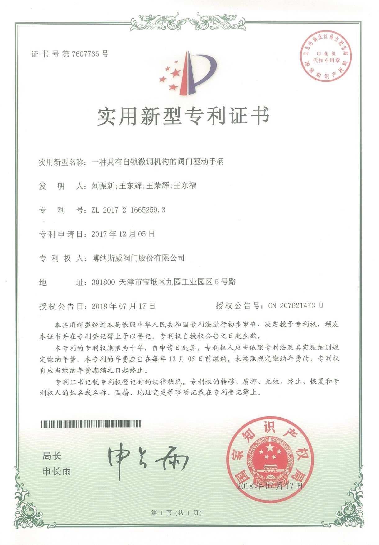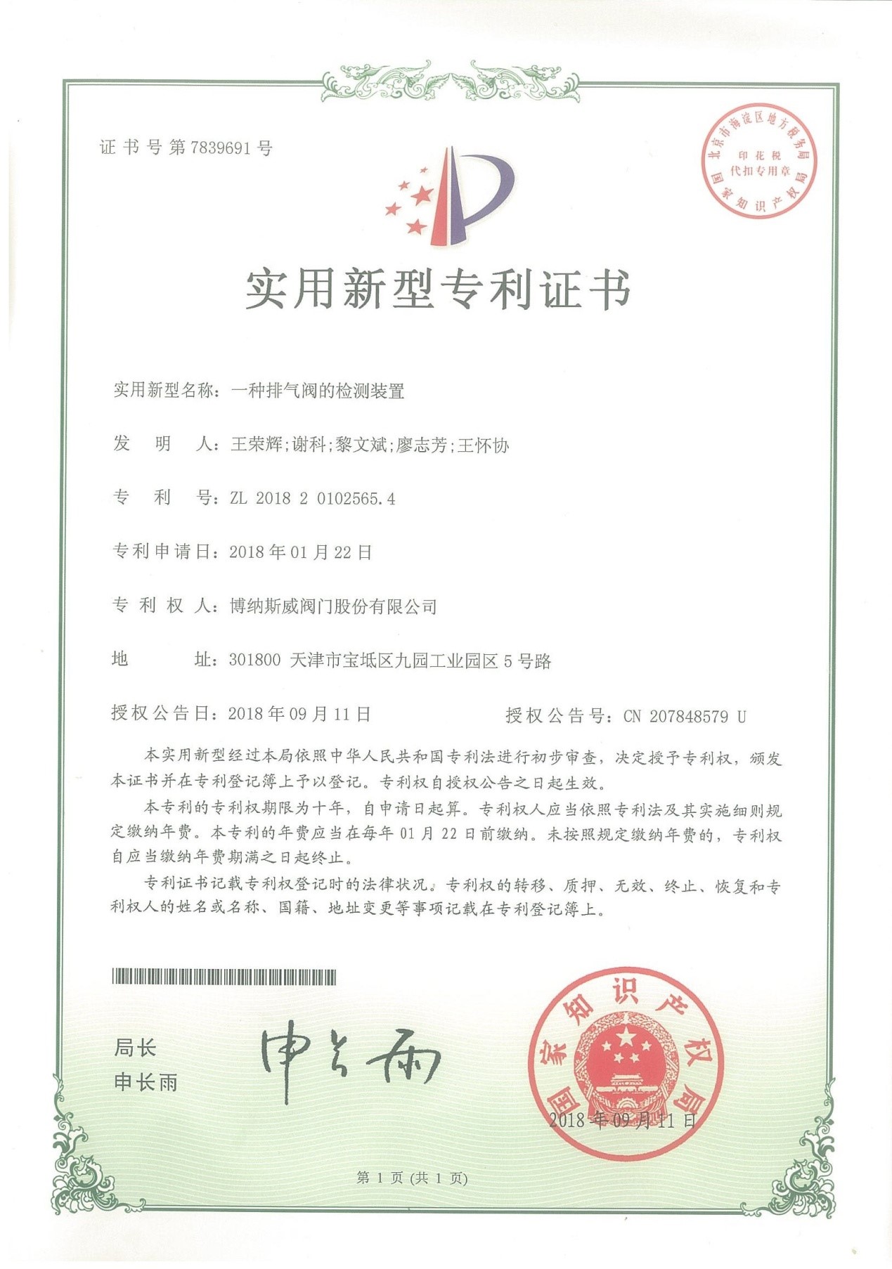公司先后通過ISO9001質量管理體系、ISO14001環境管理體系、GB/T45001職業健康安全管理體系、歐盟CE等認證,榮獲“高新技術企業”、“國防特種閥門研發中心”、“天津市企業技術中心”等榮譽。公司與武漢大學、長沙理工大學、華北水利水電大學廣泛開展產學研合作。潛心投入也結出累累碩果:獲得200余項專利技術,主編、參編國家和行業標準10多項,在業內重要期刊發表10余篇論文,榮獲中國機械工業科學技術獎1項。