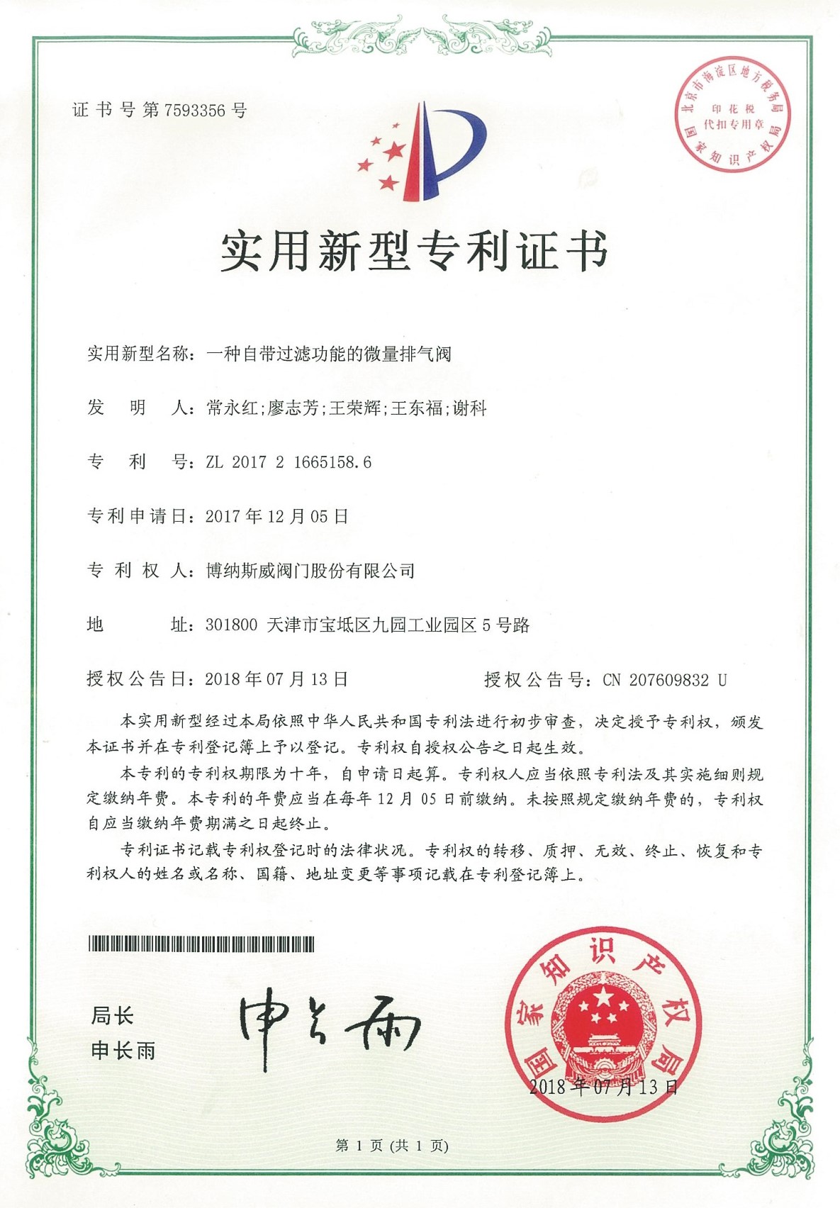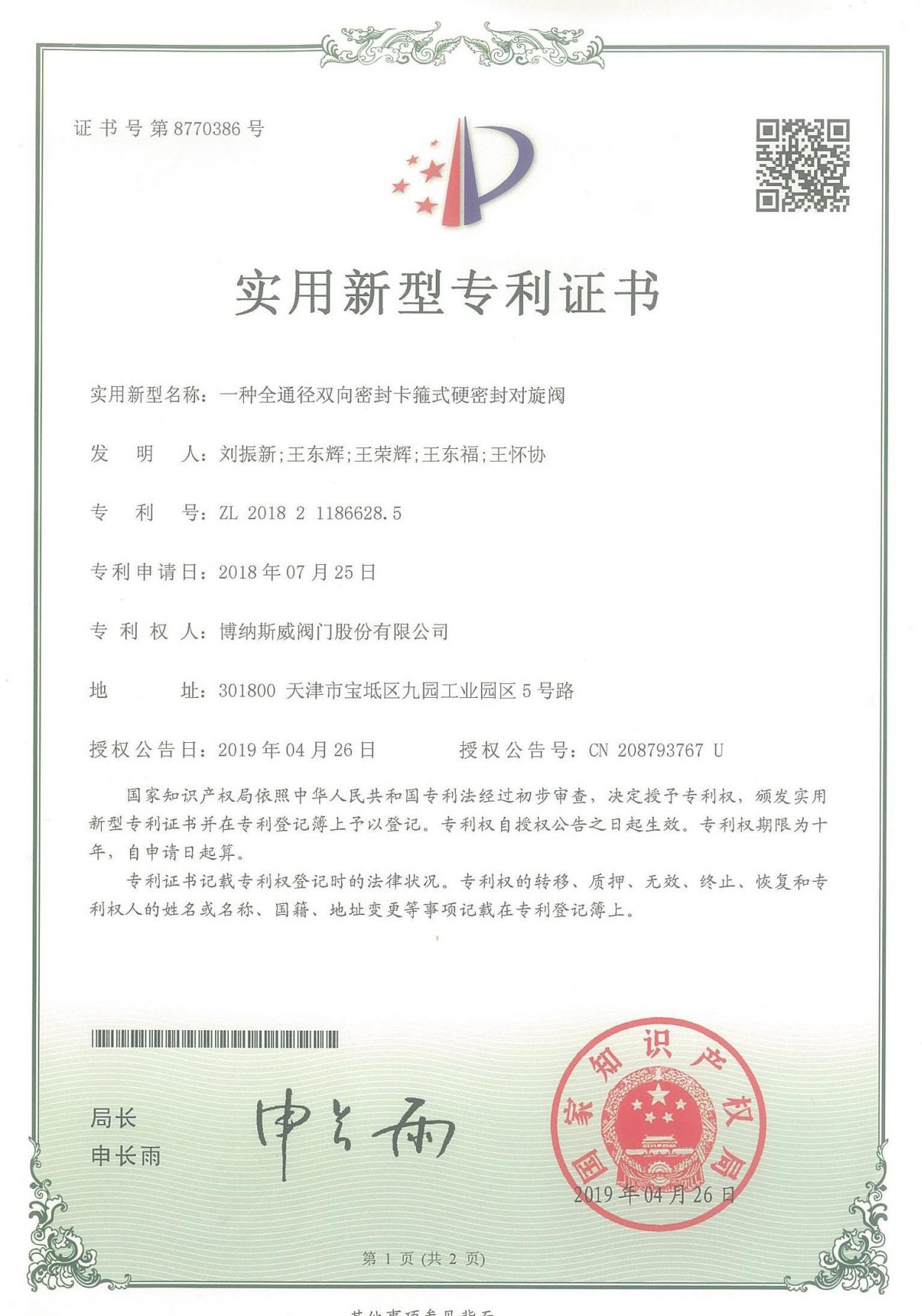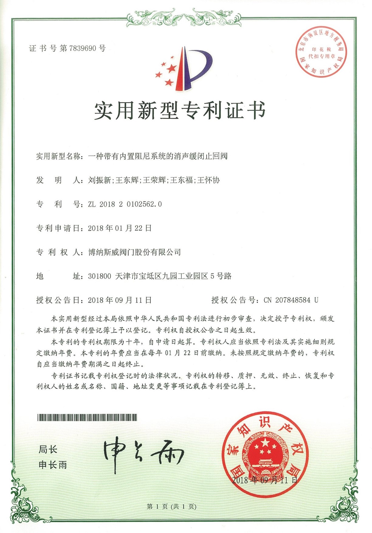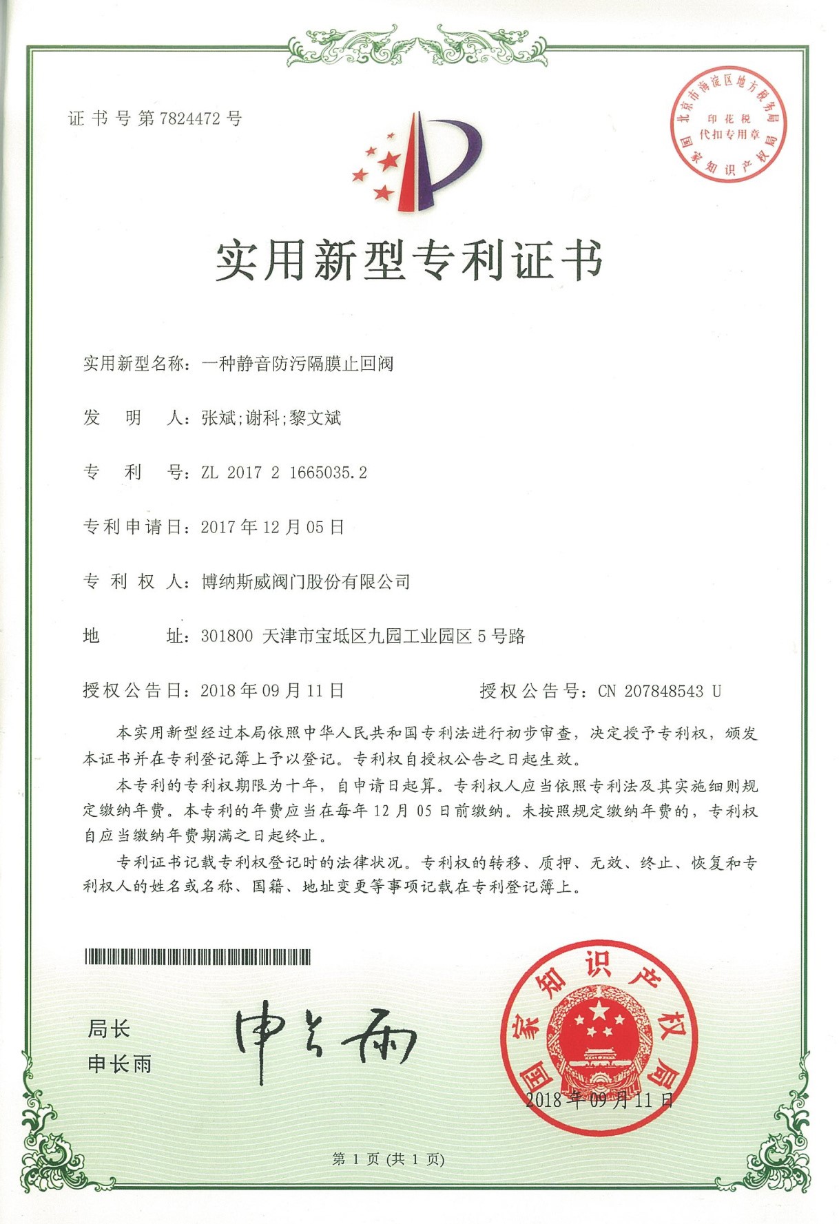 公司先后通過ISO9001質量管理體系、ISO14001環境管理體系、GB/T45001職業健康安全管理體系、歐盟CE等認證,榮獲“高新技術企業”、“國防特種閥門研發中心”、“天津市企業技術中心”等榮譽。公司與武漢大學、長沙理工大學、華北水利水電大學廣泛開展產學研合作。潛心投入也結出累累碩果:獲得200余項專利技術,主編、參編國家和行業標準10多項,在業內重要期刊發表10余篇論文,榮獲中國機械工業科學技術獎1項。