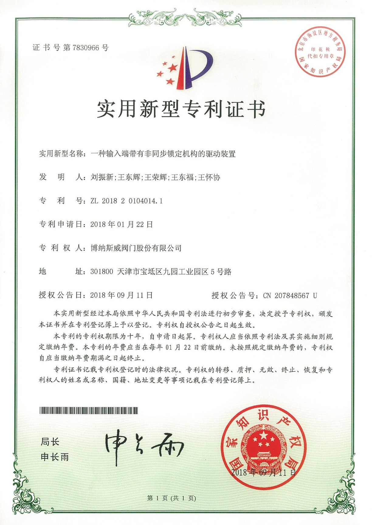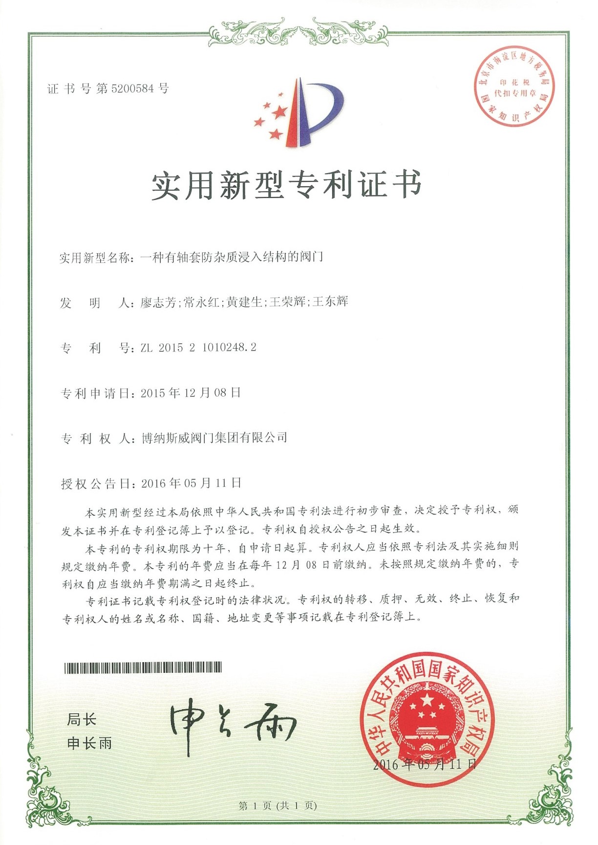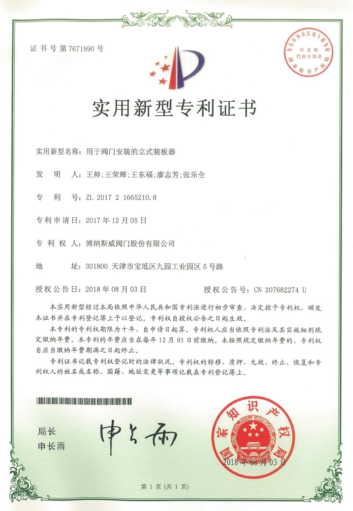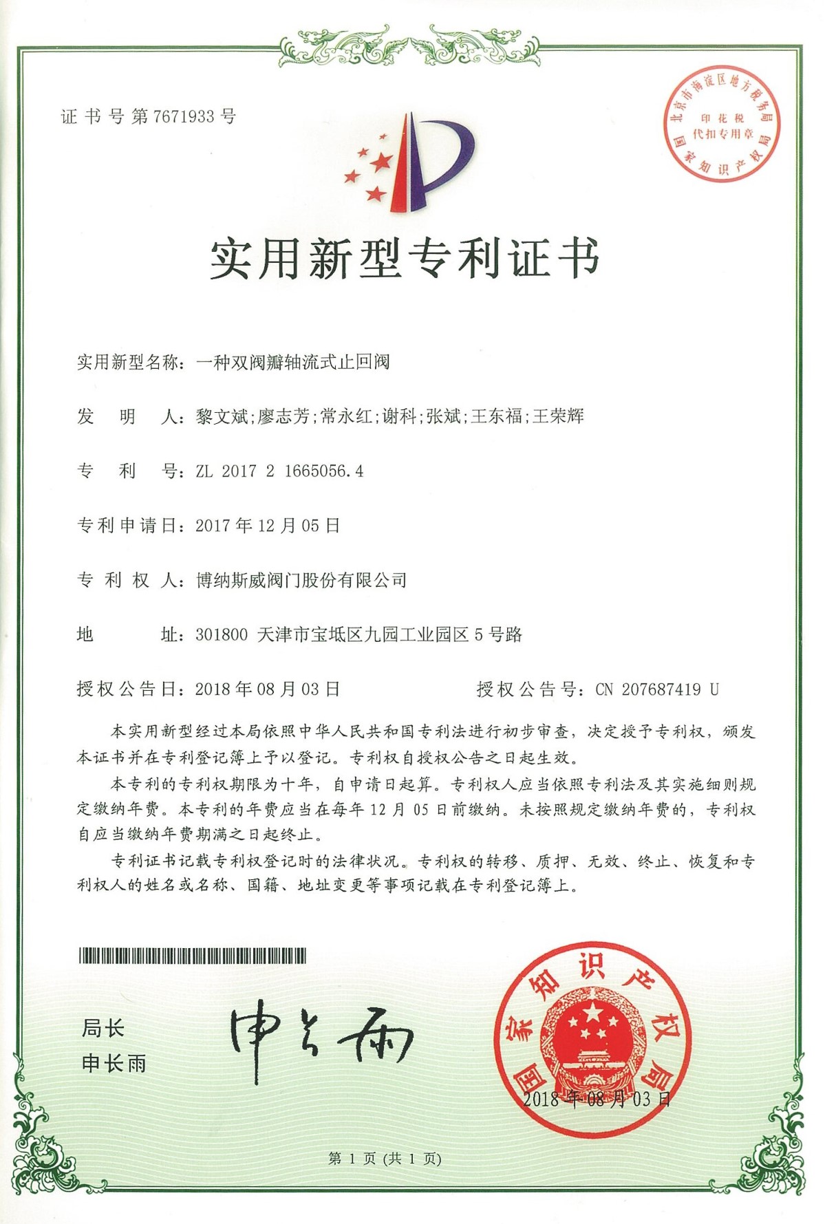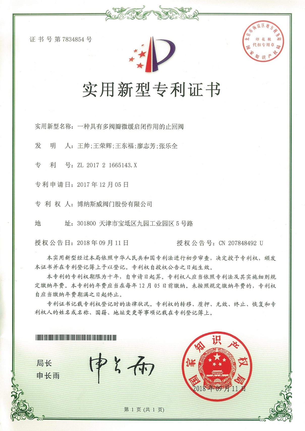 公司先后通過ISO9001質量管理體系、ISO14001環境管理體系、GB/T45001職業健康安全管理體系、歐盟CE等認證,榮獲“高新技術企業”、“國防特種閥門研發中心”、“天津市企業技術中心”等榮譽。公司與武漢大學、長沙理工大學、華北水利水電大學廣泛開展產學研合作。潛心投入也結出累累碩果:獲得200余項專利技術,主編、參編國家和行業標準10多項,在業內重要期刊發表10余篇論文,榮獲中國機械工業科學技術獎1項。