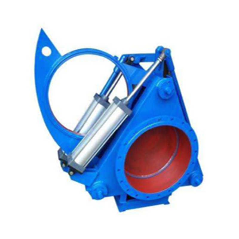 主要由左閥體、右閥體、絲桿、閘板、密封圈、杠桿、汽缸等零件組成,并由底座、支撐柱構(gòu)成一個(gè)剛性結(jié)構(gòu)體。閥門中設(shè)有夾緊、松開汽缸和翻板汽缸,夾緊、松開汽缸通過杠桿和絲桿螺旋驅(qū)動左、右閥體完成松開、夾緊動作,翻板汽缸驅(qū)動閘板完成開關(guān)動作。橡膠密封圈鑲鉗在閘板上,具有耐高溫、密封性能好、更換方便、使用壽命長等特點(diǎn)。